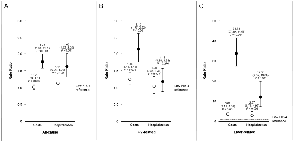The hidden price tag: Unveiling underdiagnosed and costly Metabolic Dysfunction-Associated Steatohepatitis (MASH)Metabolic Dysfunction-Associated Steatohepatitis (MASH), a progressive but often underdiagnosed disease, creates heavy clinical and economic burdens, especially in its advanced stages. A recent study by Carelon Research uncovers a high prevalence of comorbidities and underlines the importance of early detection and effective treatment to mitigate its impact. Summary The low FIB-4 reference is depicted by a horizontal, dotted line at y=1. The Y-axis scales are varied. Points are labeled with the corresponding ratio, 95% CI, and P value. High FIB-4 scores (closed circles) and intermediate FIB-4 scores (open circles), which are compared with low FIB-4 scores, are shown.