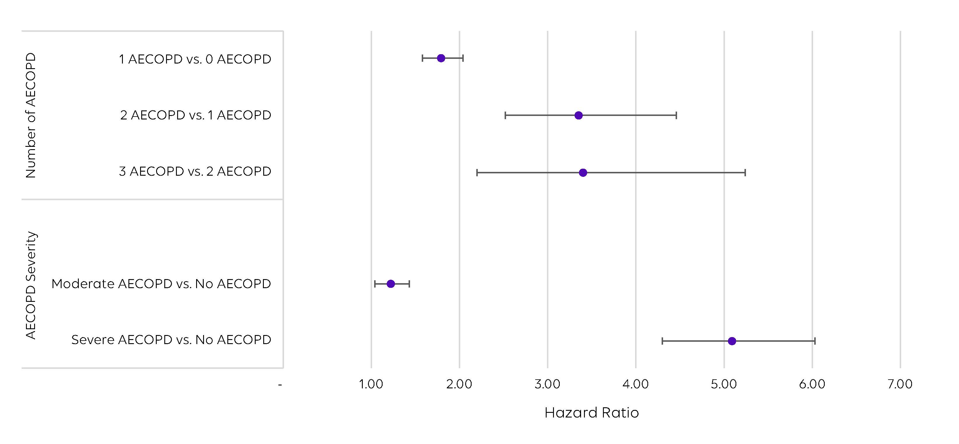 Figure 2. Subgroup analyses estimating the hazard of death by severity and number of AECOPD