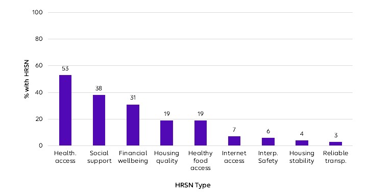 HRSNs refer to unmet social needs, such as access to healthy food, quality housing, or reliable transportation, and are associated with poorer health outcomes. A health systems’ limited information on individuals’ HRSNs can hinder the ability to fully achieve a whole health approach. Although commercially insured adults comprise approximately two-thirds of the U.S. adult population, they are the least likely to be surveyed about their social needs. Thus, little is known about the prevalence of HRSNs in this population. This analysis reports only on findings pertaining to commercially insured Elevance Health members.
