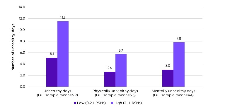 The survey was based on extant health and social need screening tools and questions, including the PRAPARE Screening Tool, the CDC Healthy Days Measure, and questions from the HRSN Screening Tool. Respondents were considered to have a specific HRSN if they indicated need through their response to at least one of the relevant survey questions. Self-reported health was assessed through the CDC Healthy Days Measure in which respondents reported the number of physically and mentally unhealthy days during the 30 days prior to the survey.