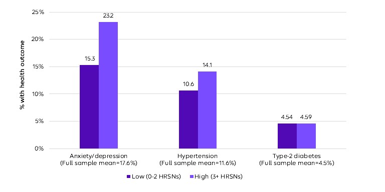 Health-related social needs and whole person healthUnmet health-related social needs (HRSNs) can be a barrier to achieving whole person health. Elevance Health developed a pilot survey to assess the prevalence of these needs among its affiliated health plan members in two states, and then linked respondents’ survey data with their claims data to evaluate how such needs relate to health, utilization, and spending. Enterprise Analytics Core domain(s): Whole person health, community health (SDoH) Summary Source: Author calculations from Elevance Health's Social Risk Survey. Source: Author calculations from Elevance Health's Social Risk Survey linked with administrative claims data. Key takeaways