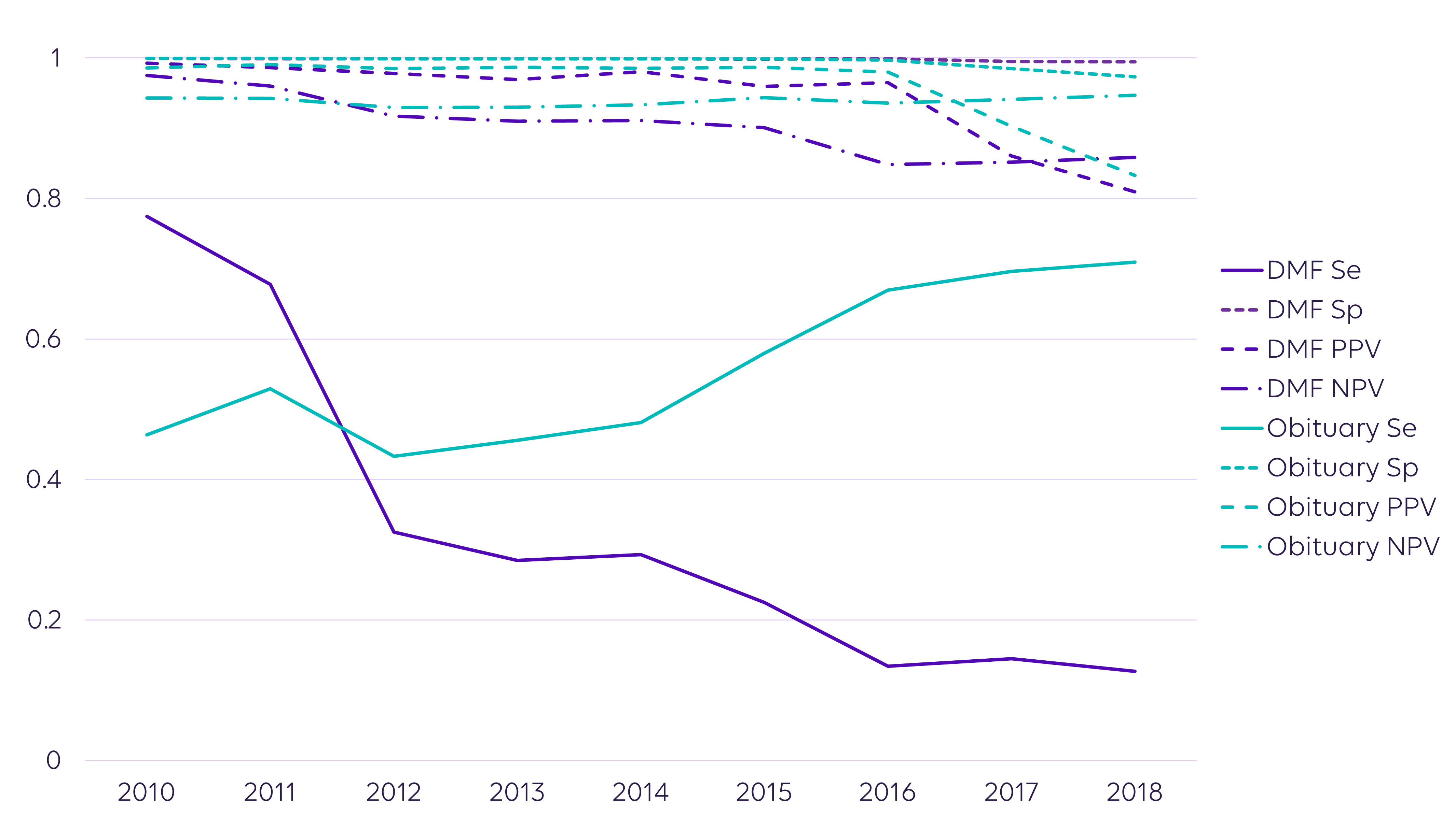 We identified death dates from any source for 27,396 of 40,692 advanced cancer patients from 2010 to 2018. In 2010, the DMF had a matching date for 77% (95% CI: 76%, 79%) of death dates identified in the NDI data (i.e. moderate sensitivity), but this declined to 13% (95% CI: 11%, 14%) in 2018. For the obituary data, these figures rose from 46% (95% CI: 45%, 48%) in 2010 to 71% (95% CI: 68%, 73%) in 2018. The presence of death date from an alternative source accurately reflected the presence of a death date in the NDI data (high PPV) throughout the study period, and a high percentage of members lacking a death date from one soure (alternative or NDI) lacked a date from the other (high specificity and NPV).